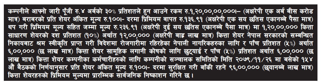 त्यस्तै कम्पनीले ५ प्रतिशत अर्थात् ६ लाख कित्ता शेयर सामूहिक लगानी कोष र ५ प्रतिशत अर्थात् ६ लाख कित्ता शेयर प्रति शेयर अंकित मूल्य रु.१०० दरमा कम्पनीका कर्मचारीहरुको लागि छुट्याई बाँकी रहेको ९६ लाख कित्ता प्रति शेयर अंकित मूल्य रु. १०० मा प्रिमियम वापत रू. १३६ दशमलव ९१ थप गरी रू. २३६ दशमलव ९१ मा शेयर सर्वसाधारणमा निष्कासन गर्दै छ ।