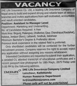 आईएमई लाईफ इन्स्योरेन्सले असिस्टेन देखि म्यानेनजर लेबल सम्मको कर्मचारी माग गरेको छ । कम्पनीले उपत्यका बाहिरका जिल्लाहरु विरगंज, मलग्वा, ढल्केवर, गैर, चन्द«निगनपुर, कलैया, जितपुर, लालबन्दी, सिन्धुली र जलेश्वर शाखाको लागि कर्मचारी माग गरेको हो । ईच्छुक आवेदकले माघ १८ गतेसम्ममा आवेदन दिनुपर्ने कम्पनीले जनाएको छ ।