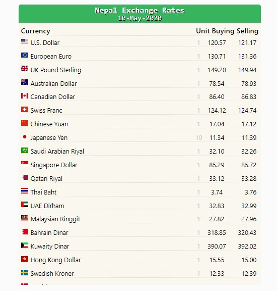 यस्तै, युरोपियन युरो एकको खरिददर १३० रुपैयाँ ७१ पैसा र विक्रिदर १३१ रुपैयाँ ३६ पैसा रहेको भने युके पाउन्ड स्ट्रीलिङको खरिददर १ सय ४९ रुपैयाँ रहेको छ भने विक्रीदर १४९ रुपैयाँ ९४ पैसा रहेको छ ।
