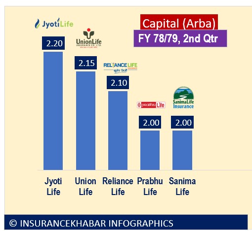 कम्पनीहरुले प्रकाशन गरेको आर्थिक वर्ष ७८/७९ को दोश्रो त्रैमासको वित्तीय विवरणको आधारमा चुक्ता पूँजी सबैभन्दा धेरै ज्योति लाइफ इन्स्योरेन्सको रहेको छ । ज्योति लाइफ इन्स्योरेन्सको चुक्ता पुँजी २ अर्ब २० करोड रहेको छ ।