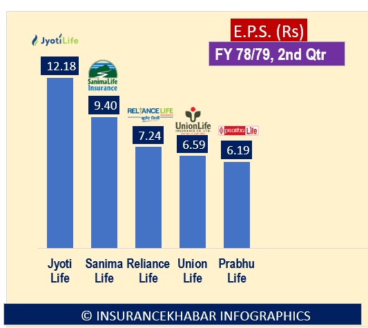 कम्पनीहरुले प्रकाशन गरेको आर्थिक वर्ष ७८/७९ को दोश्रो त्रैमासको वित्तीय विवरणको आधारमा ज्योति लाइफ इन्स्योरेन्सको प्रति शेयर आम्दानी सर्वाधिक १२ रुपैयाँ १८ पैसा रहेको छ भने सबैभन्दा थोरै प्रभु लाइफको प्रति शेयर आम्दानी ६ रुपैयाँ १९ पैसा रहेको छ।