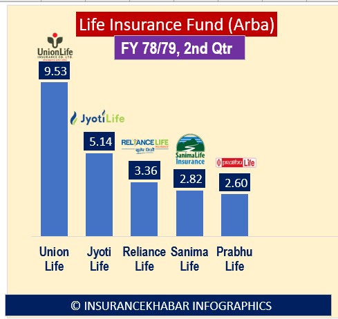 कम्पनीहरुले प्रकाशन गरेको आर्थिक वर्ष ७८/७९ को दोश्रो त्रैमासको वित्तीय विवरणको आधारमा जीवन बीमा कम्पनीहरुको जीवन बीमा कोषको ठुलो महत्व रहेकोमा युनियन लाइफ इन्स्योरेन्सको जीवन बीमा कोष सबै बलियो छ। युनियन लाइफको जीवन बीमा कोषमा ९ अर्ब ५३ करोड रहेको छ । त्यस्तै सबैभन्दा थोरै जीवन बीमा कोषमा रकम प्रभु लाइफ इन्स्योरेन्सको रहेको छ। प्रभु लाइफ इन्स्योरेन्सको जीवन बीमा कोषमा २ अर्ब ६० करोड रुपैयाँ छ।