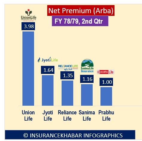 कम्पनीहरुले प्रकाशन गरेको आर्थिक वर्ष ७८/७९ को दोश्रो त्रैमाससम्मलाई आधार मान्दा युनियन लाइफ इन्स्योरेन्सले ३ अर्ब ९८ करोड खुद बीमा शुल्क आर्जन गरेको छ र सबैभन्दा थोरै प्रभु लाइफ इन्स्योरेन्सले १ अर्ब मात्र खुद बीमा शुल्क आर्जन गरेको छ ।