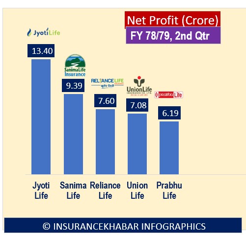 आर्थिक वर्ष ७८/७९ को दोश्रो त्रैमाससम्म ज्योति लाइफ इन्स्योरेन्सले सर्वाधिक १३ करोड ४० लाख खुद मुनाफा गरेको छ त्यस्तै सबै भन्दा थोरै खुद मुनाफा गर्नेमा प्रभु लाइफ इन्स्योरेन्स रहेको छ । प्रभु लाइफ इन्स्योरेन्सले ६ करोड १९ लाख मात्र खुद मुनाफा गरेको छ।