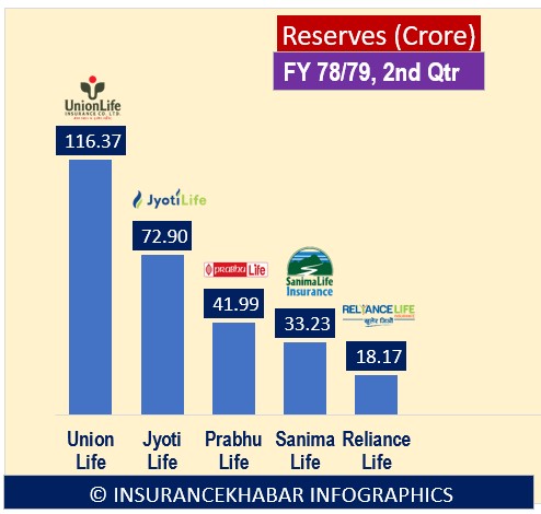 कम्पनीहरुले प्रकाशन गरेको आर्थिक वर्ष ७८/७९ को दोश्रो त्रैमासको वित्तीय विवरणको आधारमा युनियन लाइफ इन्स्योरेन्सको जगेडा कोष सबै भन्दा बलियो छ । कम्पनीको जगेडा कोषमा १ अर्ब १६ करोड रहेको छ । त्यस्तै सबै भन्दा थोरै जगेडा कोषमा रकम रिलायन्स लाइफ इन्स्योरेन्सको रहेको छ। रिलायन्स लाईफ इन्स्योरेन्सको जगेडा कोषमा १८ करोड १७ लाख रुपैयाँ छ।