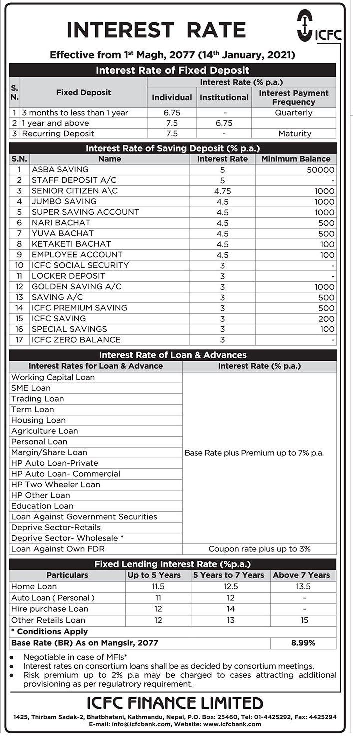 काठमाडौं । आईसीएफसी फाइनान्स लिमिटेडले नयाँ व्याजदर प्रकाशन गरेको छ । फाइनान्सले निक्षेप, कर्जा तथा मुद्धति निक्षेपमा नयाँ ब्याजदर प्रकाशन गरेको हो । कम्पनीले आज माघ १ गते, बिहीबारबाट लागू हुने गरी नयाँ व्याजदर प्रकाशन गरेको हो ।