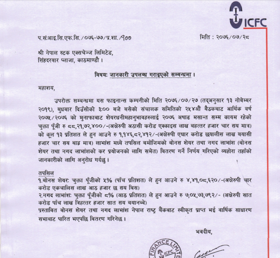 आईसीएफसी फाइनान्सद्धारा १३ प्रतिशत लाभांश प्रस्ताव, बोनश र नगद कति ?