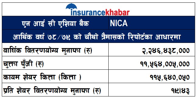 चौथो त्रैमासको वित्तीय विवरण अनुसार कम्पनीको वितरण योग्य मुनाफा २ अर्ब २४ करोड रहेको छ भने कम्पनीको चुक्ता पुँजी ११ अर्ब ५६ करोड रहेको छ ।