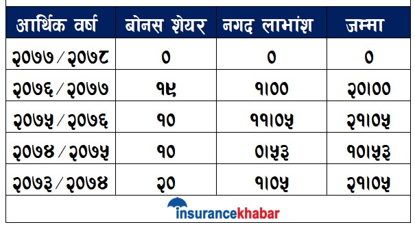 कम्पनीले आर्थिक वर्ष ७७/७८ मा कुनै पनि लाभांश दिएन । लाभांश दिने क्षमता हुँदा हुँदै पनि नियामकीय निर्देशन बमोजिम कम्पनीले लाभांश दिन सकेको थिएँन । नाफा वितरण गर्न नसक्दा आर्थिक वर्ष ७७/७८ को मुनाफा कम्पनीले रिटेन गरेर राखेको कारणले गर्दा कम्पनीको रिपोर्ट आउँदा निकै बलियो नेट्वर्थ देखिएको छ ।