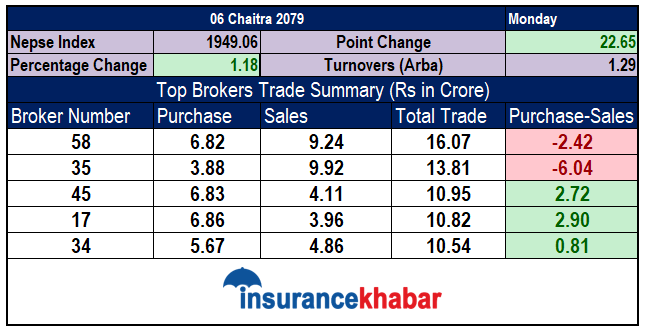 त्यस्तै दोश्रोमा ब्रोकर नम्बर ३५ मा सर्वाधिक कारोबार गरेको छ। ब्रोकर नम्बर ३५ बाट ३ करोड ८८ लाखको खरिद हुँदा ९ करोड ९२ लाखको बिक्री भएको छ । सुरुका दुई ब्रोकरले बिक्री धेरै गरेका छन् भने शिर्ष ५ का बाँकी ३ ब्रोकरले खरिद धेरै गरेका छन् ।