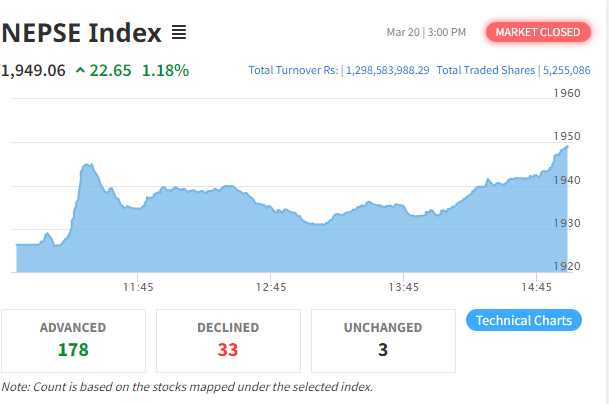 आजको बजारको ग्राफ हेर्दा बुलिस ग्राफ बनेको देखिन्छ। बजार बन्द हनु भन्दा १ घण्टा अघि देखि बजार बढ्न थालेको देखिन्छ। प्राविधिक हिसाबमा यसलाई सकारात्मक रूपमा हेरिन्छ ।