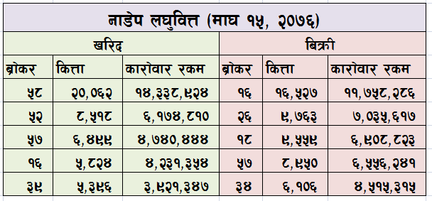 आज नाडेप लघुवित्तको शेयर ५८ नम्बर ब्रोकरबाट आक्रामक रुपमा खरिद भएको छ। आज ५८ नम्बर ब्रोकरबाट नाडेपको १ करोड ४३ लाख बराबरको शेयर खरिद भएको छ भने १६ नम्बर ब्रोकरबाट १ करोड १७ लाख बराबरको शेयर बिक्री भएको छ।
