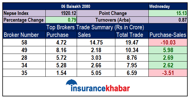 आज ब्रोकरहरूको कारोबारलाई हेर्दा ब्रोकर नम्बर ५८ बाट सर्वाधिक कारोबार भएको देखिन्छ । ब्रोकर नम्बर ५८ बाट १९ करोड ४७ लाखको कारोबार भएको छ । जसमा ४ करोड ७२ लाखको खरिद र १४ करोड ७५ लाखको विक्री भएको देखिन्छ । सर्वाधिक कारोबार गरेको ब्रोकर नम्बर ५८ बाट खरिदको तुलनामा १० करोड धेरै विक्री भए पनि आज ५८ नम्बर ब्रोकरबाट ८ करोड ८३ लाखको स्वावलम्बन लघुवित्तको सस्थापक शेयर विक्री भएको हो । सो सस्थापक शेयर म्याचिङ्ग नभएर अरू ब्रोकरबाट खरिद भएको कारणले गर्दा ब्रोकर नम्बर ५८ को खरिद र विक्रीमा ठूलो अन्तर देखिएको हो ।