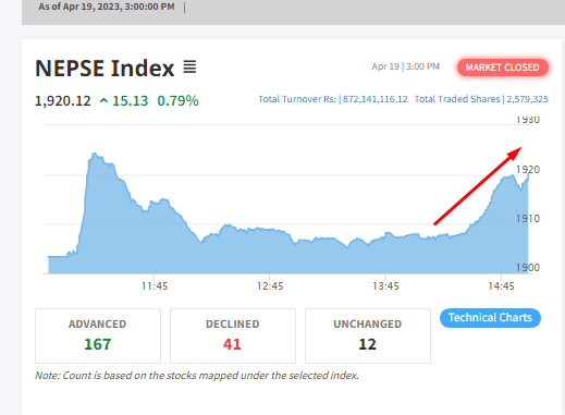 आजको बजार वृद्धिको ट्रेण्ड हेर्दा सुरूको १५ मिनेट बजार आक्रामक सिधा भर्टिकल लाईनमा वृद्धि भएको र त्यस पश्चात बजारमा विक्री चाप देखिएको थियो तर बजार बन्द हुनु ३० मिनेट अघि बजारमा पुन खरिदकर्ता आएसंगै बजारमा दोहोरो अंकको वृद्धि देखिएको हो ।