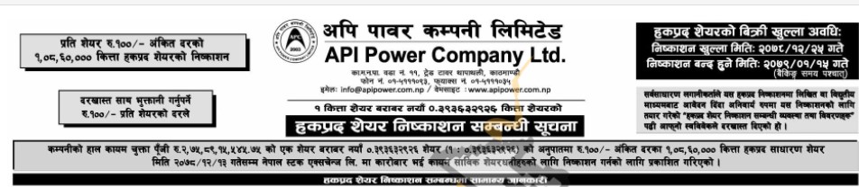 काठमाडौं । अपि पावरले आज चैत २५ गतेदेखि हकप्रद शेयर निष्काशन गर्दैछ । कम्पनीले ३९ दशमलव ३६ प्रतिशत अर्थात् १ कित्ता बराबर शुन्य दशमलब ३९३६ का दरले १ अर्ब ८ करोड ६० लाख बराबरको १ करोड ८ लाख ६० हजार कित्ता हकप्रद शेयर निष्काशन गर्ने भएको हो ।