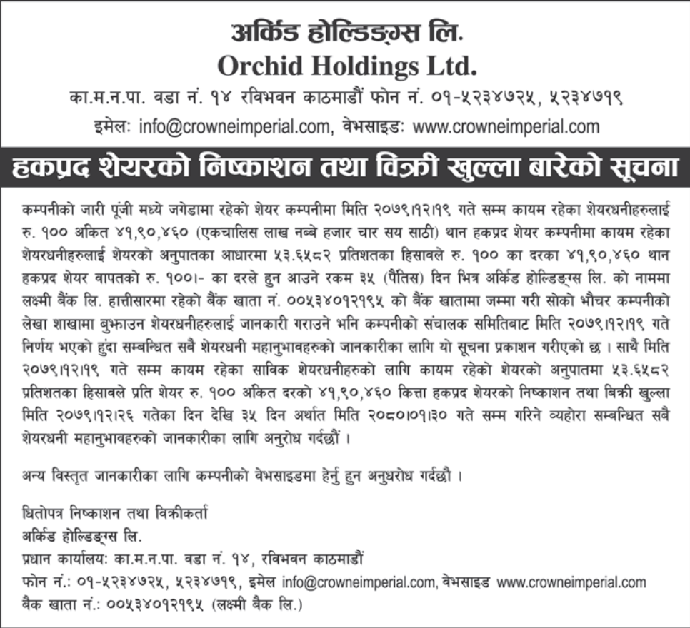 काठमाडौं । अर्किड होल्डिङ्ग्स लिमिटेडले आज चैत २६ गतेदेखि ५३ दशमलव ६५८२ प्रतिशत हकप्रद शेयर विक्री गर्ने भएको छ । कम्पनीले चैत १९ गतेसम्म कायम शेयरधनीहरूका लागि प्रतिशेयर १ सय रुपैयाँ अंकित मूल्यको ४१ लाख ९० हजार ४६० कित्ता हकप्रद शेयर विक्री गर्ने जनाएको छ ।