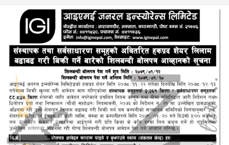 काठमाडौं । आइएमईको जनरल इन्स्योरेन्स लिमिटेडले आजदेखि अवितरित हकप्रद शेयर लिलामी प्रक्रियाबाट विक्री गर्दैछ । कम्पनीले गत फागुन १२ गतेदेखि चैत १३ गतेसम्म विक्री खुला गर्दा वितरण हुन नसकेको संस्थापक समूहको २ हजार २६१ कित्ता र सर्वसाधारण समूहतर्फको ८८ हजार ९३४ कित्ता शेयर लिलामी प्रक्रियाबाट विक्री गर्न लागेको हो ।