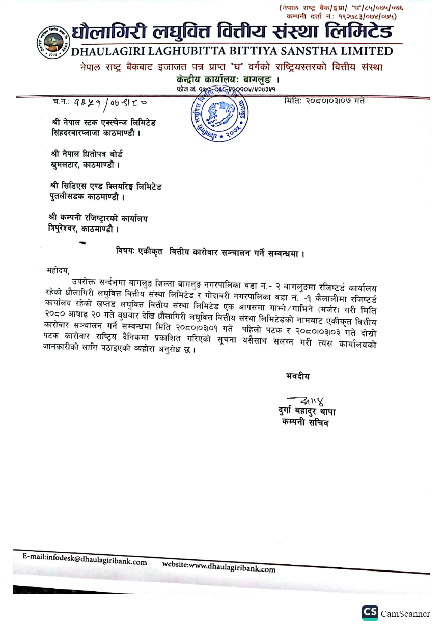 नेपाल धितोपत्र बोर्डले दुबै कम्पनीले असार ६ गते मर्जर सम्बन्धी अन्तिम स्वीकृति प्रदान गरेको थियो । यस्तै मर्जर पश्चात कायम हुने संस्थाको केन्द्रीय कार्यालय बाग्लुङ्ग नगरपालिका वडा नं २, बाग्लुङ्ग रहनेछ ।