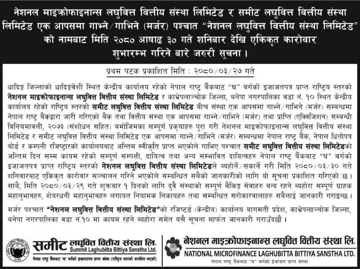 असार २२ गते नेपाल राष्ट्र बैंकले नेशनल माइक्रोफाइनान्स र समीट लघुवित्तबीचको मर्जरलाई अन्तिम स्वीकृति प्रदान गरेको थियो । नेशनल माइक्रोफाइनान्स लघुवित्त र समिट लघुवित्तबीच १ः०.७३ शेयर स्वाप रेसियोमा मर्जरमा गएका हुन् ।