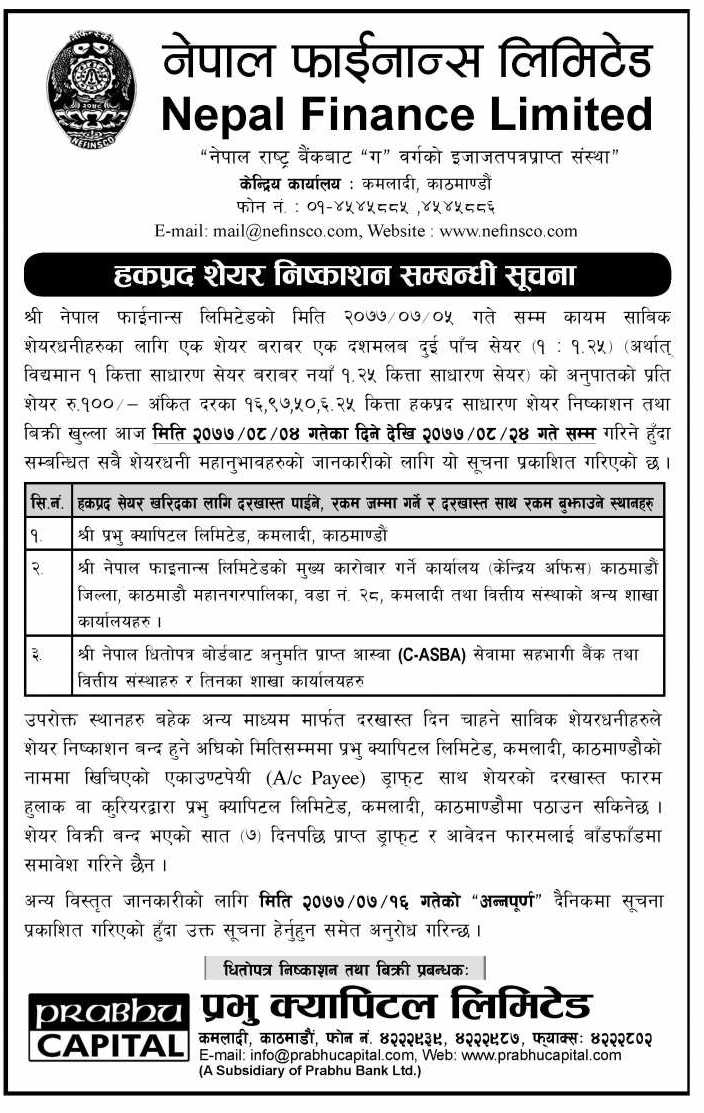 लगानीकर्ताले बिक्री प्रबन्धक प्रभु क्यापिटल, नेपाल फाइनान्सको केन्द्रीय कार्यालय तथा अन्य शाखा कार्यालयहरुह र नेपाल धितोपत्र बोर्डबाट स्वीकृती प्राप्त गरेका सम्पूर्ण सि आस्वा सेवामा सहभागी बैंक तथा वित्तीय संस्था र तिनका शाखा कार्यालयहरुबाट आवेदन दिन सकिने कम्पनीले जनाएको छ ।