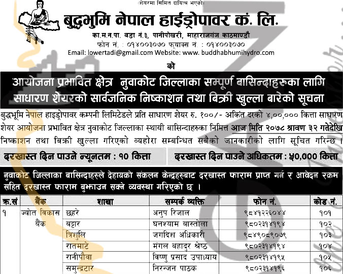 बुद्धभुमीले १२ लाख कित्ता साधारण शेयरमध्ये १० प्रतिशतले हुन आउने ४ लाख कित्ता शेयर नुवाकोट जिल्लाका बासिन्दाका लागि छिटोमा भदौ १४ गतेसम्म र ढिलोमा भदौ २९ गतेसम्म बिक्री खुला गर्ने छ । स्थानीय प्रभावित बासिन्दाले नुवाकोट जिल्लामा रहेका बैंकहरु ज्योति विकास बैंक, प्रभु बैंक र सिभिल बैंकका शाखा कार्यालय मार्फत आवेदन दिन सक्नेछन् ।