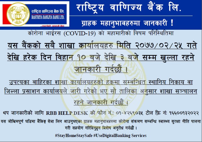 बैंकका अनुसार सबै शाखा कार्यालयहरू बिहान १० बजेदेखि दिउँसो ३ बजेसम्म खुला रहने जनाइएको छ।