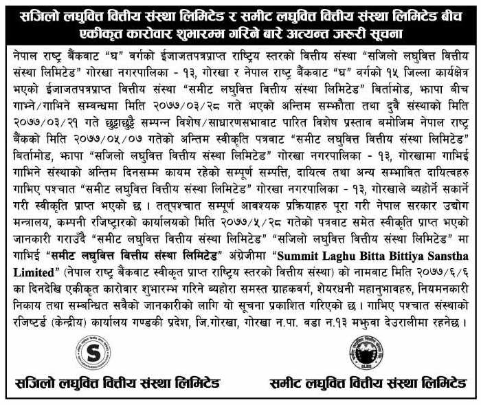 काठमाडौं । समीट लघुवित्त वित्तीय संस्था लिमिटेड र सजिलो लघुवित्त वित्तीय संस्था लिमिटेडले आज असोज ६ गते मंगलबारदेखि एकीकृत कारोबार शुरु गर्ने भएका छन् ।