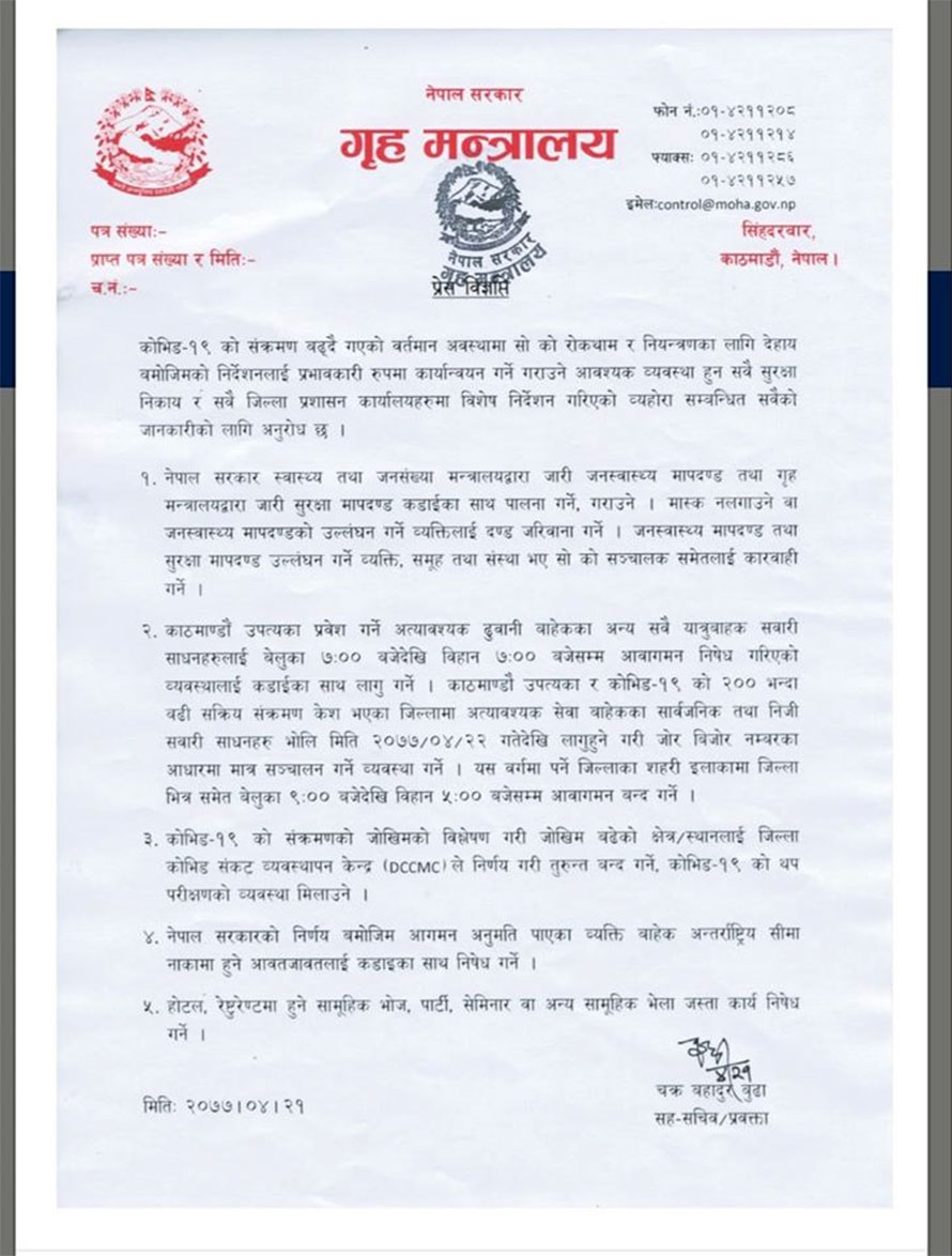 गृहमन्त्रालयले निजी तथा सार्वजनिक सवारी साधनमा जोर विजोर प्रणाली लागू गरिएको जनाउँदै कोभिडबाट सुरक्षित राख्न् राति ९ बजेदेखि विहान ५ बजेसम्म हिडडुल गर्न समेत प्रतिबन्ध लगाएको छ । मन्त्रलयका अनुसार अब रातिको समयमा हिडडुल गर्न पूर्ण प्रतिबन्ध लगाइएको छ ।