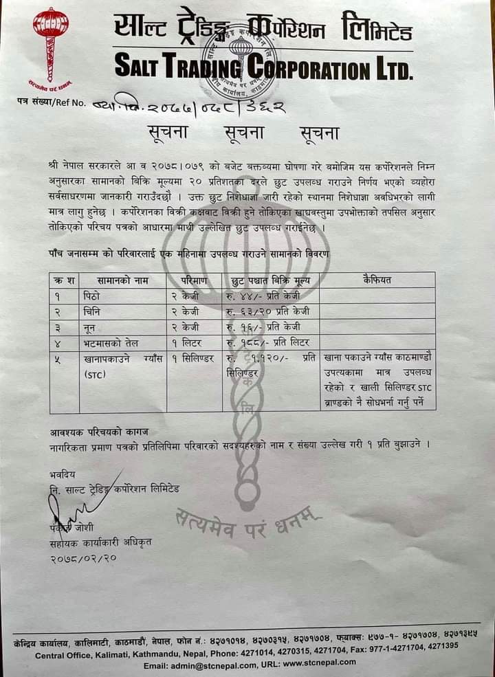 जस अनुसार अब चिनीको मूल्य ६३ रुपैयाँ २० पैसा, खाना पकाउने ग्याँसको भाउ ११ सय २० रुपैयाँ, पीठो प्रतिकिलो ४४ रुपैयाँ, नून प्रतिकिलो १६ रुपैयाँ, भटमासको तेल प्रतिलिटर १८८ रुपैयाँमा बिक्री गरिने कम्पनीले जनाएको छ ।