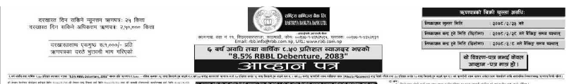 लगानीकर्ताले उक्त ऋणपत्रमा छिटोमा जेठ २८ गते र असार ३ गतेसम्म आवेदन दिन सक्नेछन् । उक्त ऋणपत्रमा लगानीकर्ताले न्यूनतम २५ कित्तादेखि अधिकतम २ लाख ५० हजार कित्तासम्म आवेदन दिन सक्नेछन् । बैंकलाई इक्रा नेपालले ‘केयर एनपी सिंगल प्लस’ रेटिङ दिएको छ ।