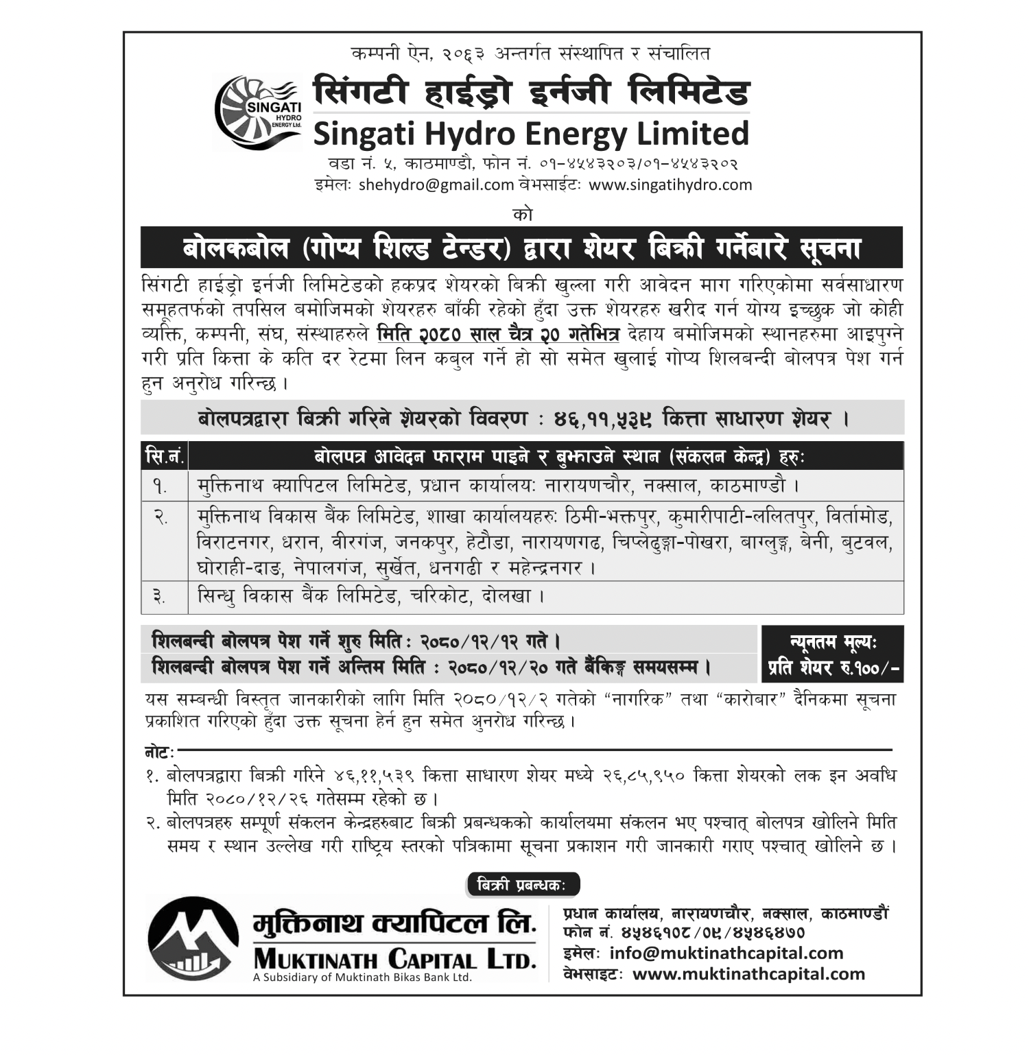 काठमाडौं । सिंगटी हाइड्रो इनर्जी लिमिटेडको अवितरित हकप्रद शेयरमा आज चैत १२ गतेबाट बोलपत्र पेश गर्न सकिने भएको छ । कम्पनीले आज चैत १२ गतेबाट हकप्रद शेयर लिलाम बढाबढ मार्फत विक्री विक्री गर्न लागेको हो । चैत २० गतेभित्र निबेदन आइपुग्ने गरि आबेदन दिनलाई ईच्छुक सर्वसाधारणलाई कम्पनीले एक सूचना जारी गर्दै जानकारी गराएको छ ।