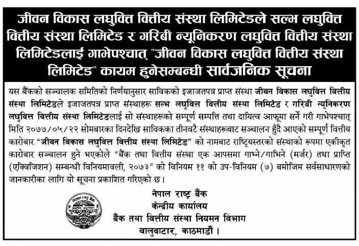 काठमाडौं । तीन वटा लघुवित्त वित्तीय संस्थाले आज भदौ २२ गतेदेखि एकिकृत कारोबार सुरु गरेका छन् । जीवन विकास लघुवित्त, सल्भ लघुवित्त र गरिबी न्यूनिकरण लघुवित्तले जीवन विकास लघुवित्त वित्तीय संस्था लिमिटेडको नामबाट एकिकृत कारोबार शुरु गरेका हुन्।