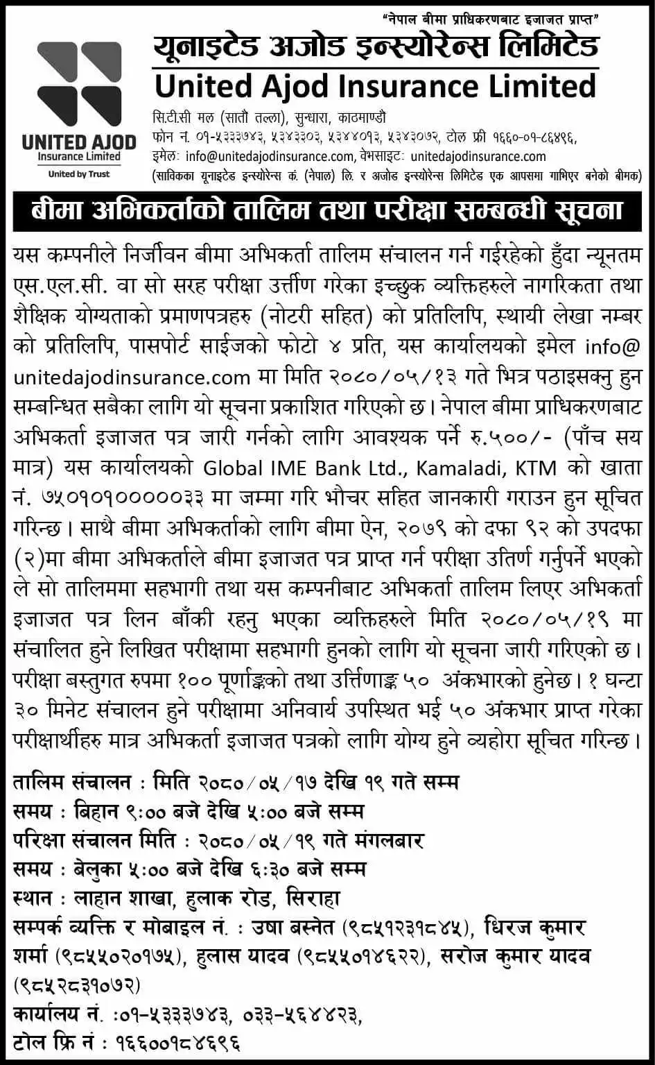 काठमाडौं । यूनाइटेड अजोड इन्स्योरेन्सले आज भदौ १७ गतेदेखि १९ गतेसम्म बीमा अभिकर्ता तालिम संचालन गर्दैछ । साथै तालिम पछि बीमा अभिकर्ताको परीक्षा भने भदौ १९ गते हुने जनाएको छ । उक्त तालिम विहान ९ बजेदेखि साझ ५ बजेसम्म संचालन हुनेछ । परीक्षा भने भदौ १९ गते साझ ५ बजेदेखि ६ः३० सम्म हुनेछ ।