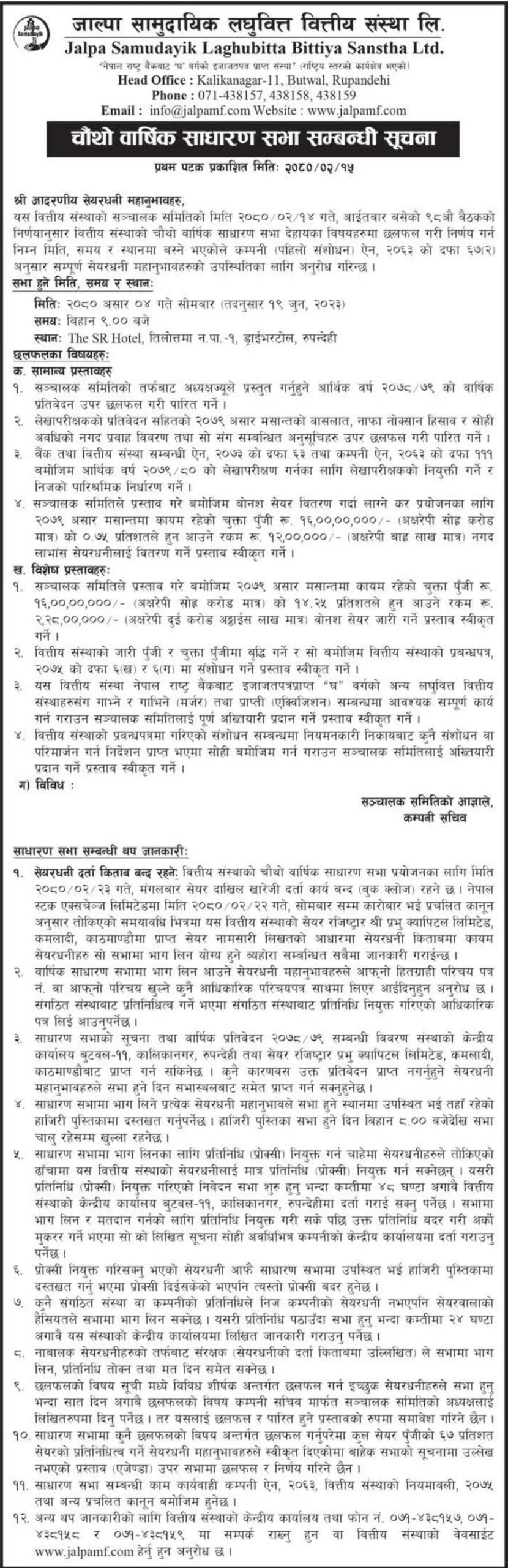काठमाडौं । जाल्पा सामुदायिक लघुवित्त वित्तीय संस्था लिमिटेडको लाभांश सुरक्षित गर्ने आज अन्तिम दिन रहेको छ । कम्पनीले साधारण सभा प्रयोजनका लागि कम्पनीले जेठ २३ गते एक दिन बुक क्लोज गर्ने भएको छ । यसको आधारमा आज जेठ २२ गतेसम्म कायम शेयरधनीहरू मात्र सभामा भाग लिन र लाभांश प्राप्त गर्न योग्य हुनेछन् ।