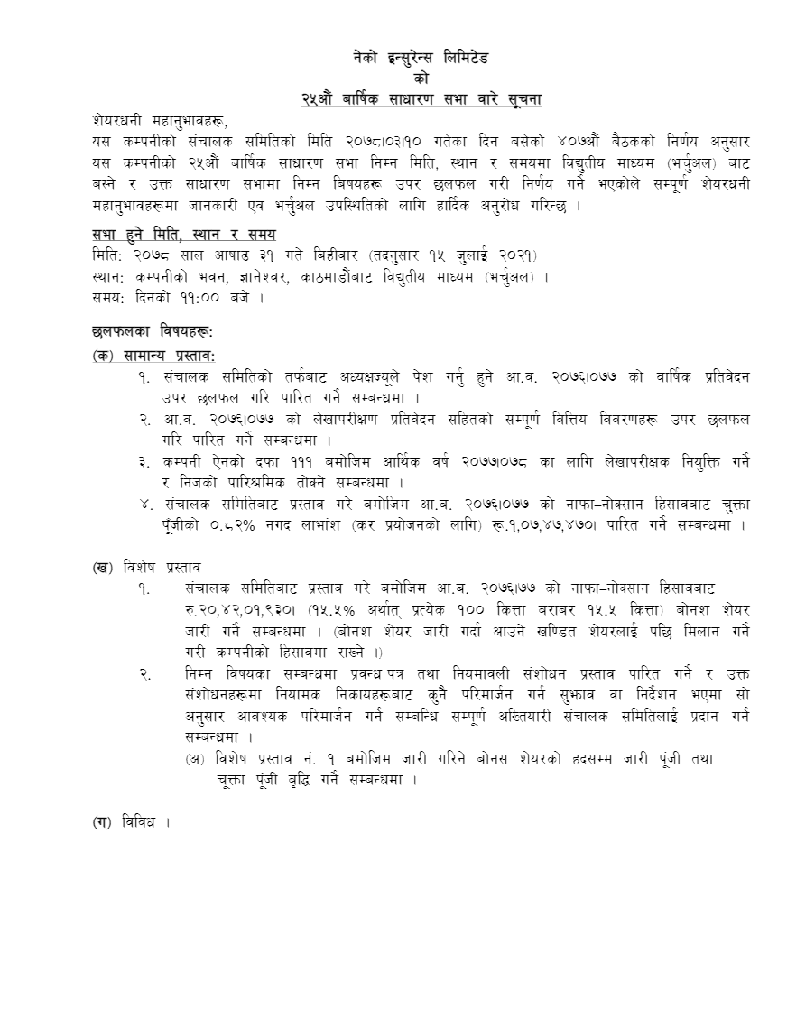 कम्पनीले असार ३१ गते २५ औं वार्षिक साधारणसभा डाकेको छ । कम्पनीले ज्ञानेश्वरको भवनमा भर्चुअल माध्यमबाट साधारणसभा गर्ने भएको छ । सभा आफ्नै भवन ज्ञानेश्वर काठमाडौंमा बिहान ११ बजे गर्ने जानकारी गराएको हो ।