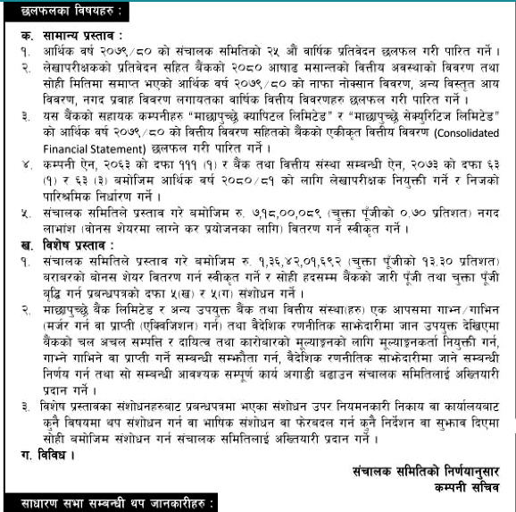 त्यसैगरी, सभाले अन्य उपयुक्त बैंक तथा वित्तीय संस्थाहरुसँग मर्जर अथवा एक्विजिशनसम्बन्धि कार्य गर्न तथा बैंकको प्रबन्धपत्र तथा नियमावली संशोधन गर्न सञ्चालक समितिलाई अख्तियारी दिने, लेखापरीक्षक नियुक्त गर्ने लगायतका प्रस्तावहरु पनि सो सभाले पारित गर्नेछ।