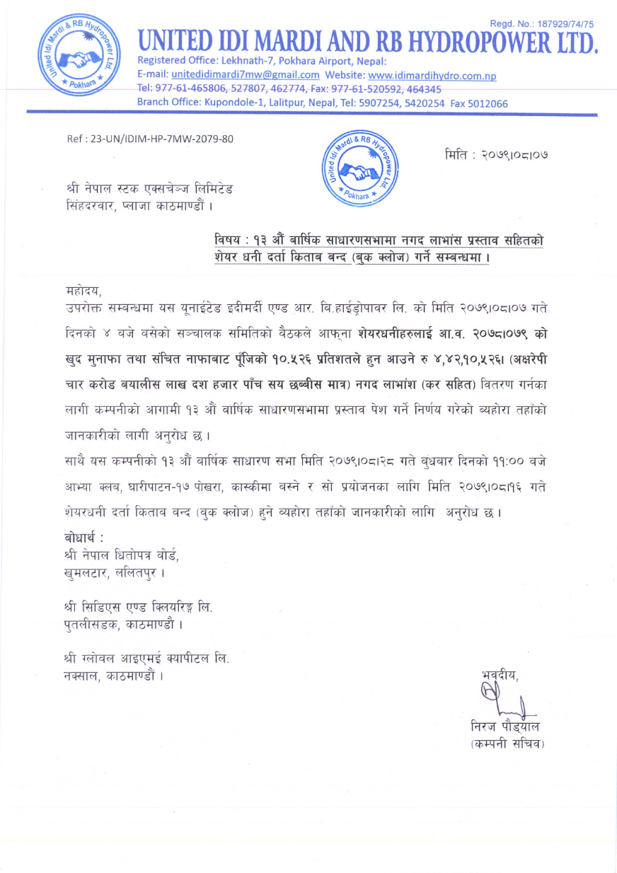 प्रस्तावित लाभांश १३ औ वार्षिक साधारणसभाबाट पारित भए पछि मात्रै शेयरधनीहरुले प्राप्त गर्ने छन् । कम्पनीले २०७९ मंसिर २८ गते पोखराको आभ्या क्लब घारीपाटन १७ मा सभा आयोजना गर्दैछ ।