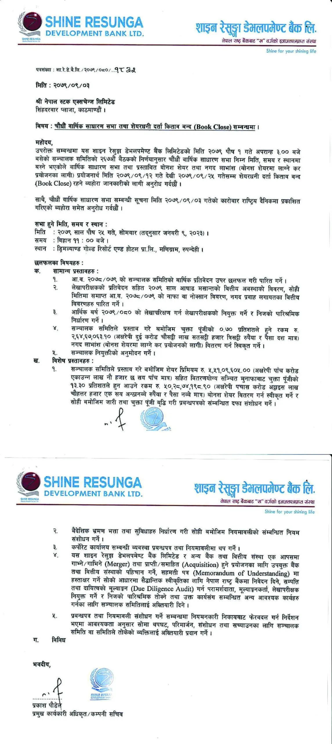 काठमाडौं । शाइन रेसुंगा डेभलपमेन्ट बैंकको लाभांश सुरक्षित गर्ने आज अन्तिम दिन रहेको छ । बैंकले साधारणसभा प्रयोजनको लागि पुस १२ देखि पुस २५ गतेसम्म बुक क्लोज गर्ने निर्णय गरेको छ । त्यसकारण आज पुस ११ गतेसम्म कायम शेयरधनीले मात्र बैंकको सभामा भाग लिन र पस्तावित लाभांश पाउनेछन् ।