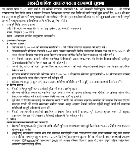 बैंकले आफ्नो १८औं वार्षिक साधारण सभा पुष ३ गते गर्ने भएको छ । बैंकले उक्त सभा अम्रपाली ब्यांक्वेट बालुवाटार काठमाडौंमा गर्ने जनाएको छ । सभा विहान ११ बजे गर्नेछ । कम्पनीको मंसिर २ गते बसेको संचालक समितिको बैठकले उक्त सभाको मिति तय गरेको हो ।
