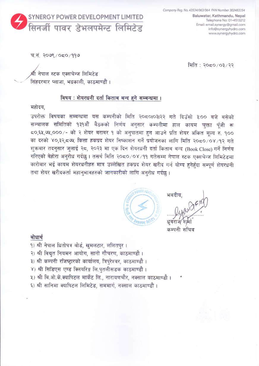 काठमाडौं । सिनर्जी पावर डेभलपमेन्ट लिमिटेडको हकप्रद शेयर सुरक्षित गर्ने आज अन्तिम दिन रहेको छ । कम्पनीले हकप्रद शेयर निष्काशनको लागि साउन १२ गते भोलि बुक क्लोज गर्ने निर्णय गरेको हो । त्यसकारण आज साउन ११ गतेसम्म कायम शेयरधनीले मात्र कम्पनीको हकप्रद शेयरमा आवेदन दिन सक्ने छन् ।