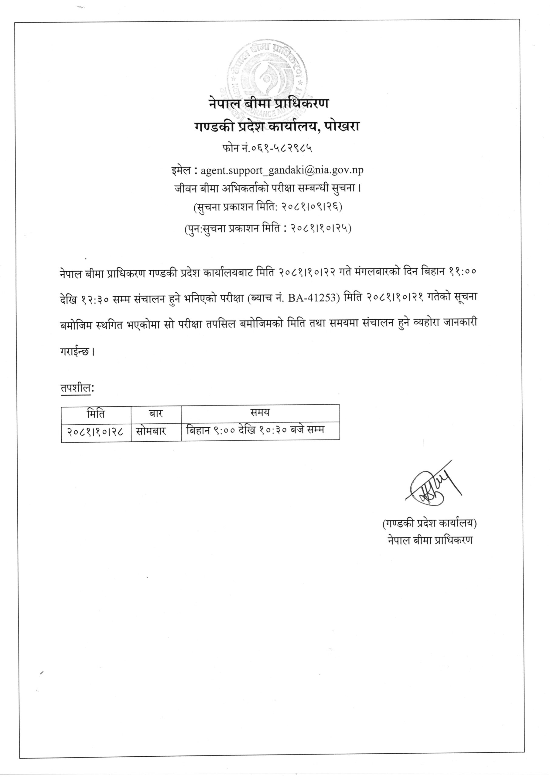 काठमाडौं । नेपाल बीमा प्राधिकरणको गण्डकी प्रदेश कार्यालयले आज माघ २८ गते जीवन बीमा अभिकर्ताको परीक्षा सञ्चालन गर्दैछ। बीमा प्राधिकरण गण्डकी प्रदेश कार्यालयबाट माघ २२ गते विहान ११ बजेबाट १२ः३० बजेसम्म हुने भनिएको परीक्षा माघ २१ गतेको सूचना बमोजिम स्थगित भई सो तालिम आज माघ २८ गते साढे ९ बजेदेखि १०३० बजेसम्म परीक्षा सञ्चालन गर्ने जनाएको छ ।