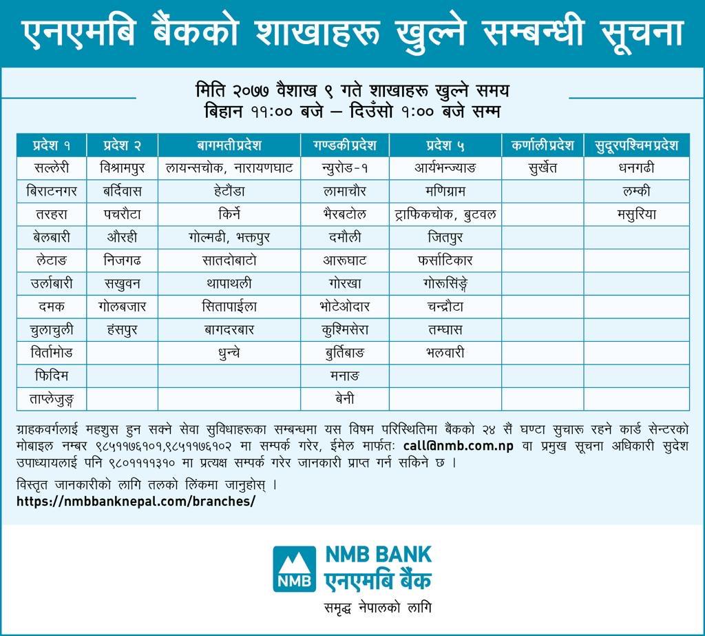 आज एनएमबि बैंकले यी शाखा कार्यालय मार्फत सेवा दिने