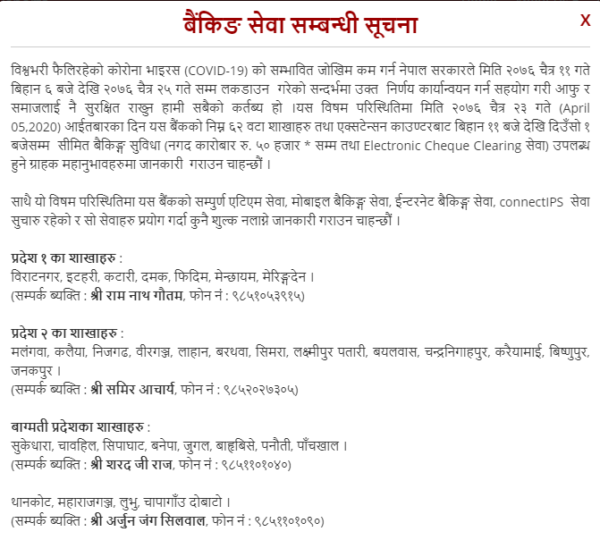 साथै, यो विषम परिस्थितिमा यस बैंकको सम्पुर्ण एटिएम सेवा, मोबाइल बैकिङ्ग सेवा, ईन्टरनेट बैकिङ्ग सेवा, कनेक्ट आईपीएस सेवा सुचारु रहेको र सो सेवाहरु प्रयोग गर्दा कुनै शुल्क नलाग्ने बैंकले जनाएको छ ।