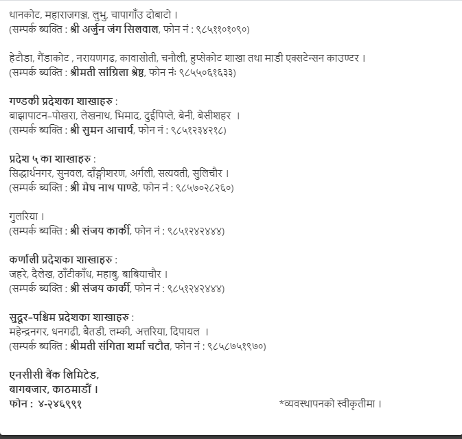 आज एनसीसी बैंकले यी शाखा कार्यालयबाट सेवा दिने