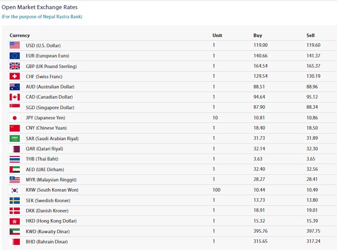 काठमाडौं । नेपाल राष्ट्र बैंकको अनुसार आज एक अमेरिकि डलरको खरिददर १ सय १९ रुपैयाँ र विक्रिदर १ सय १९ रुपैयाँ ६० पैसा रहेको छ । त्यस्तै, यूरोपियन यूरोको खरिददर १ सय ४० रुपैयाँ ६६ पैसा र विक्रिदर १ सय ४१ रुपैयाँ ३७ पैसा रहेको छ । यूको पाउन्ड स्टिलिङको खरिददर १ सय ६४ रुपैयाँ ५४ पैसा र विक्रिदर १ सय ६५ रुपैयाँ ३७ पैसा रहेको छ ।