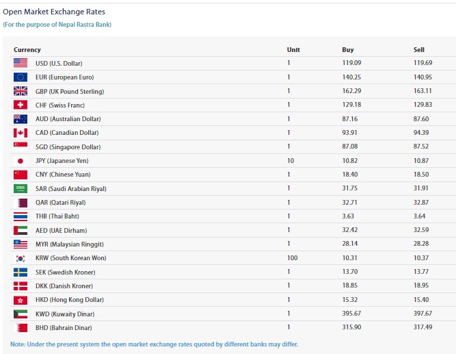 त्यस्तै, यूरोपियन यूरोको खरिददर १ सय ४० रुपैयाँ २५ पैसा र विक्रिदर १ सय ४० रुपैयाँ ९५ पैसा रहेको छ । यूको पाउन्ड स्टिलिङको खरिददर १ सय ६२ रुपैयाँ २९ पैसा र विक्रिदर १ सय ६३ रुपैयाँ ११ पैसा रहेको नेपाल राष्ट्र बैंकले जनाएको छ ।