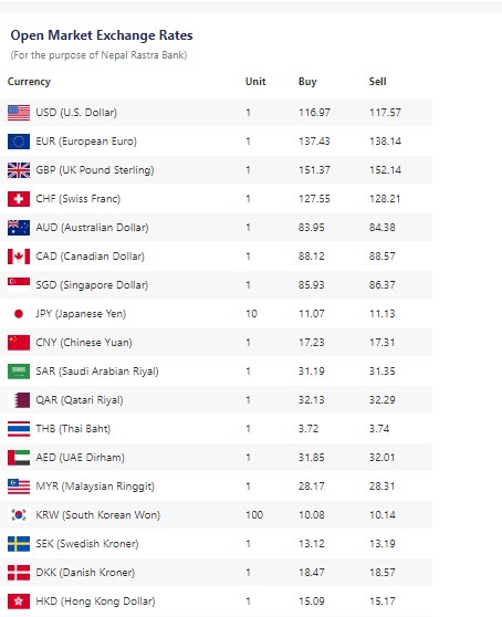 त्यस्तै, युरो एकको खरिददर १ सय ३७ रुपैयाँ ४३ पैसा र बिक्रीदर १ सय ३८ रुपैयाँ १४ पैसा रहेको छ । यसैगरी पाउण्ड एकको खरिददर १ सय ५१ रुपैयाँ ३७ पैसा र बिक्रीदर १ सय ५२ रुपैयाँ १४ पैसा रहेको छ ।