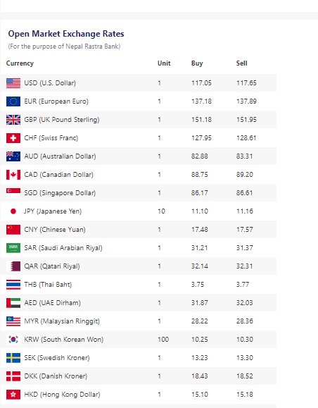 त्यस्तै, युरो एकको खरिददर १ सय ३७ रुपैयाँ १८ पैसा र बिक्रीदर १ सय ३७ रुपैयाँ ८९ पैसा रहेको छ । यसैगरी पाउण्ड एकको खरिददर १ सय ५१ रुपैयाँ १८ पैसा र बिक्रीदर १ सय ५१ रुपैयाँ ९५ पैसा रहेको छ ।