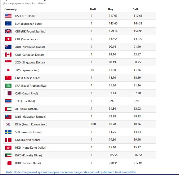 काठमाडौं । नेपाल राष्ट्र बैंकको अनुसार आज एक अमेरिकि डलरको खरिददर ११७ रुपैयाँ ३ पैसा र बिक्रिदर ११७ रुपैयाँ ६३ पैसा रहेको छ । त्यस्तै, यूरोपियन यूरोको खरिददर १ सय ४३ रुपैयाँ ६० पैसा र बिक्रिदर १४४ रुपैयाँ ३३ पैसा रहेको छ।