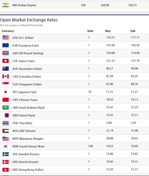 त्यस्तै, यूरोपियन यूरोको खरिददर १ सय ४१ रुपैयाँ ६९ पैसा र बिक्रिदर १४२ रुपैयाँ ४२ पैसा रहेको छ । यूको पाउन्ड स्टिलिङको खरिददर १ सय ५९ रुपैयाँ ०८ पैसा र बिक्रिदर १५९ रुपैयाँ ९० पैसा रहेको छ ।